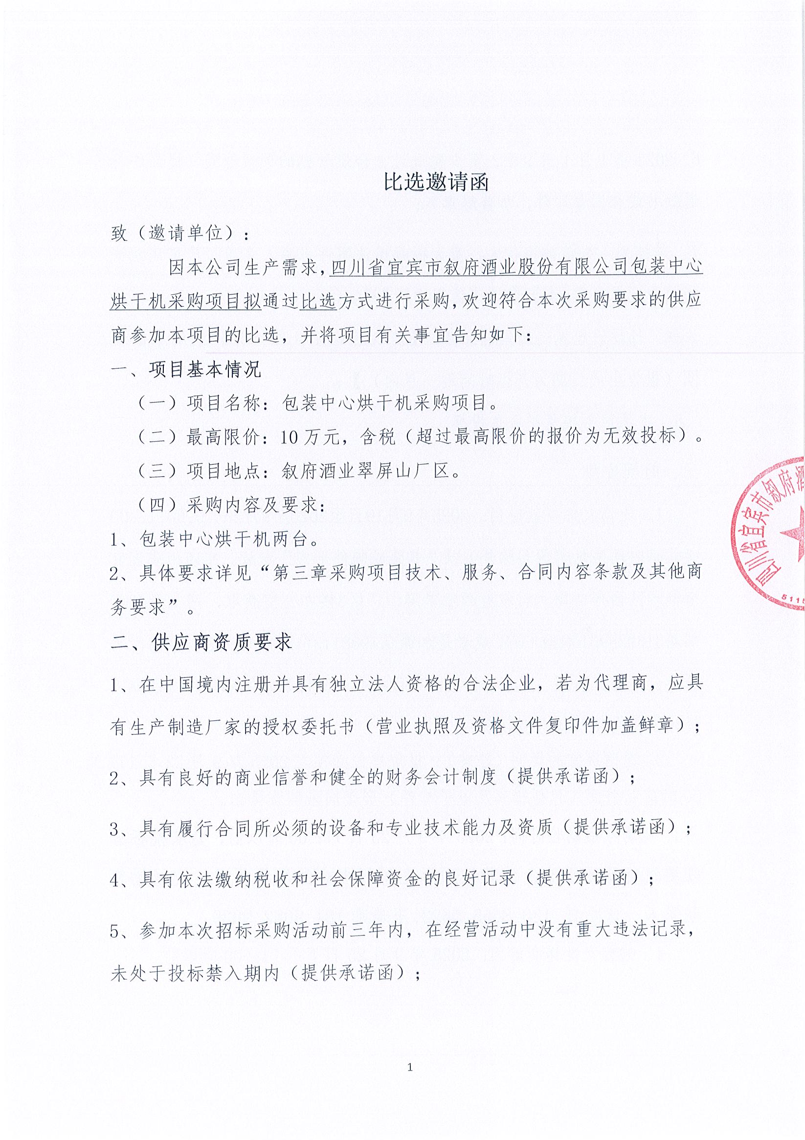 四川省宜賓市敘府酒業(yè)股份有限公司包裝中心烘干機采購項目比選招標(biāo)公示公告