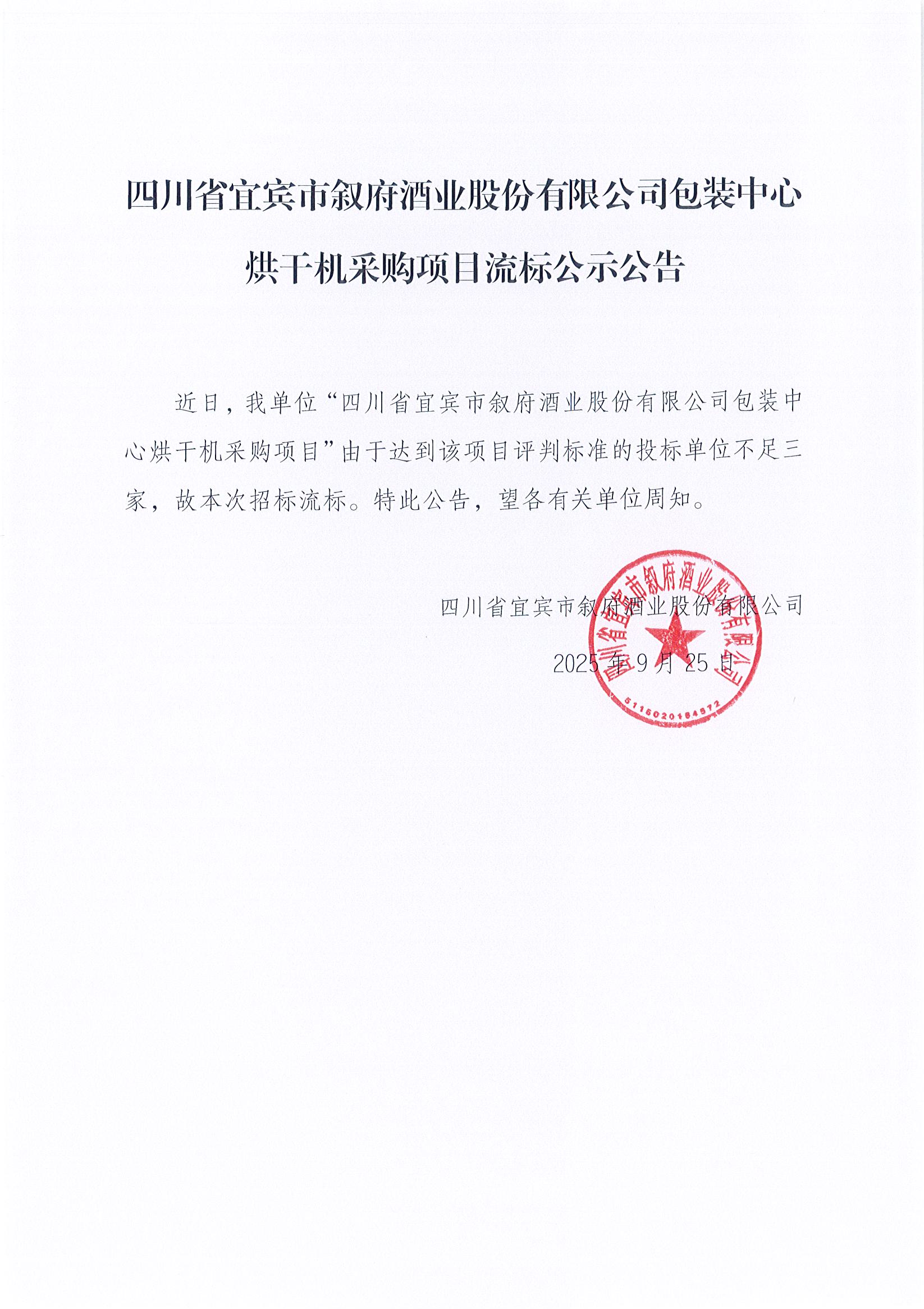四川省宜賓市敘府酒業(yè)股份有限公司包裝中心烘干機采購項目流標(biāo)公示公告